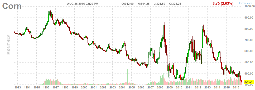 Admittedly, we don't have a good view on the fundamentals in the corn market, but simply looking at its long term chart, we could conclude that corn has a structural problem. Whether that is oversupply or declining production costs, we do not really know. Two decades ago, the price of corn was 3 times higher than it is today, so this does not seem a profitable market for running a business. As investors and traders, we should closely monitor what is happening at this price level. We believe that options trading could be an interesting option depending on how prices evolve in the coming weeks. The post Long Term Corn Chart: What If This Secular Double Bottom Does Not Hold? appeared first on Investing Haven. |